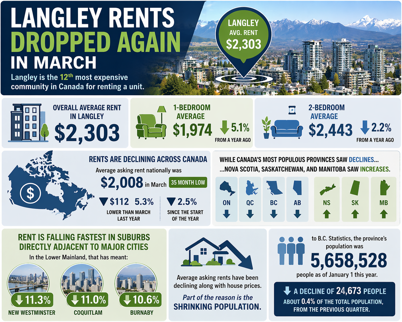 Rents are continuing to fall across much of Canada, and Langley is part of the trend.