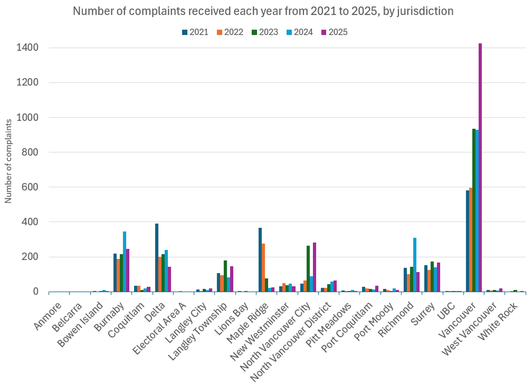 The Township of Langley is consistently among the jurisdictions generating the most complaints, alongside Vancouver, Burnaby, Delta, Richmond, and Surrey.