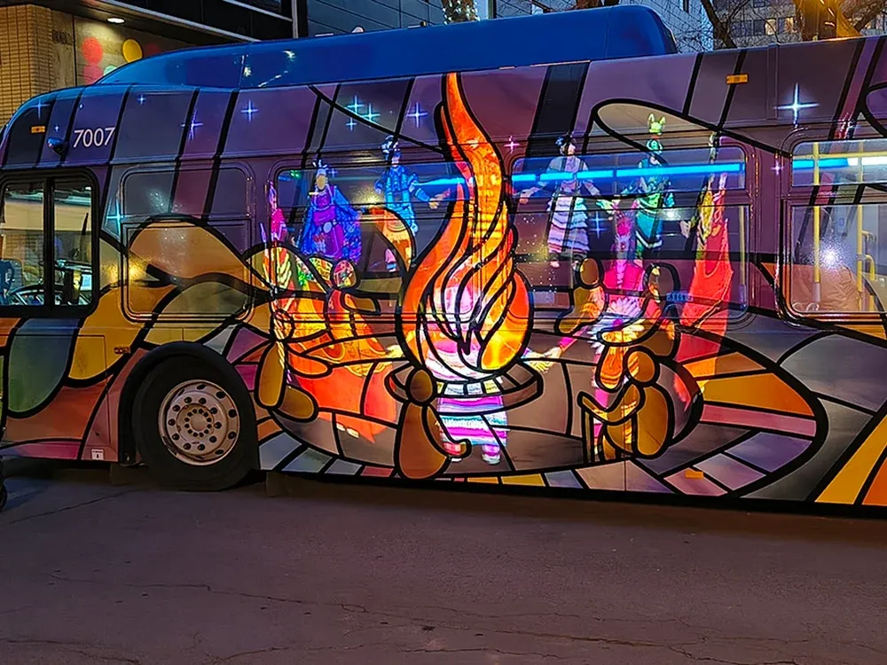 The Edmonton Aboriginal Seniors Centre worked with city transit staff to create a bus wrap featuring symbols like teepees and fires that represent their summer gatherings and the warmth of community connection.
