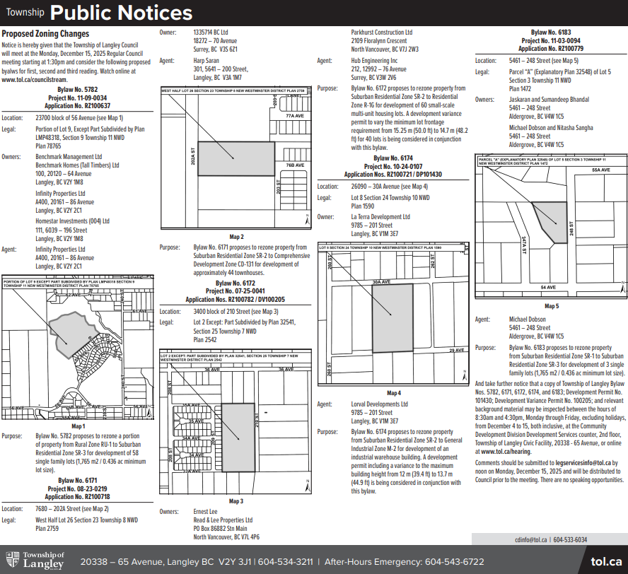 Langley Township Council will consider five rezoning applications at their December 15 meeting, including proposals for 58 single-family lots in rural areas and 44 new townhouses.