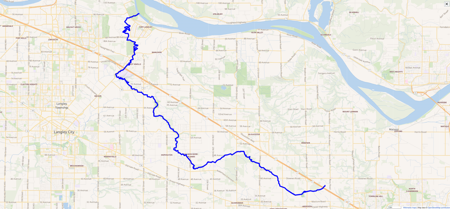 The Salmon River flows through Langley before emptying into Bedford Channel near Fort Langley, and it remains one of the few fish-sustaining streams left in the Metro Vancouver area.