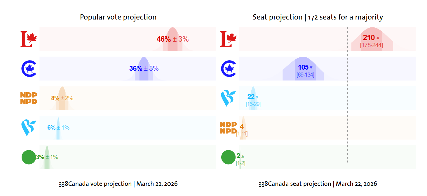 According to 338Canada's latest projection, the Liberals under Mark Carney sit at an average of 209 projected seats, more than 100 ahead of the Conservatives at 106, the highest Liberal projection in the model's nearly decade-long history.