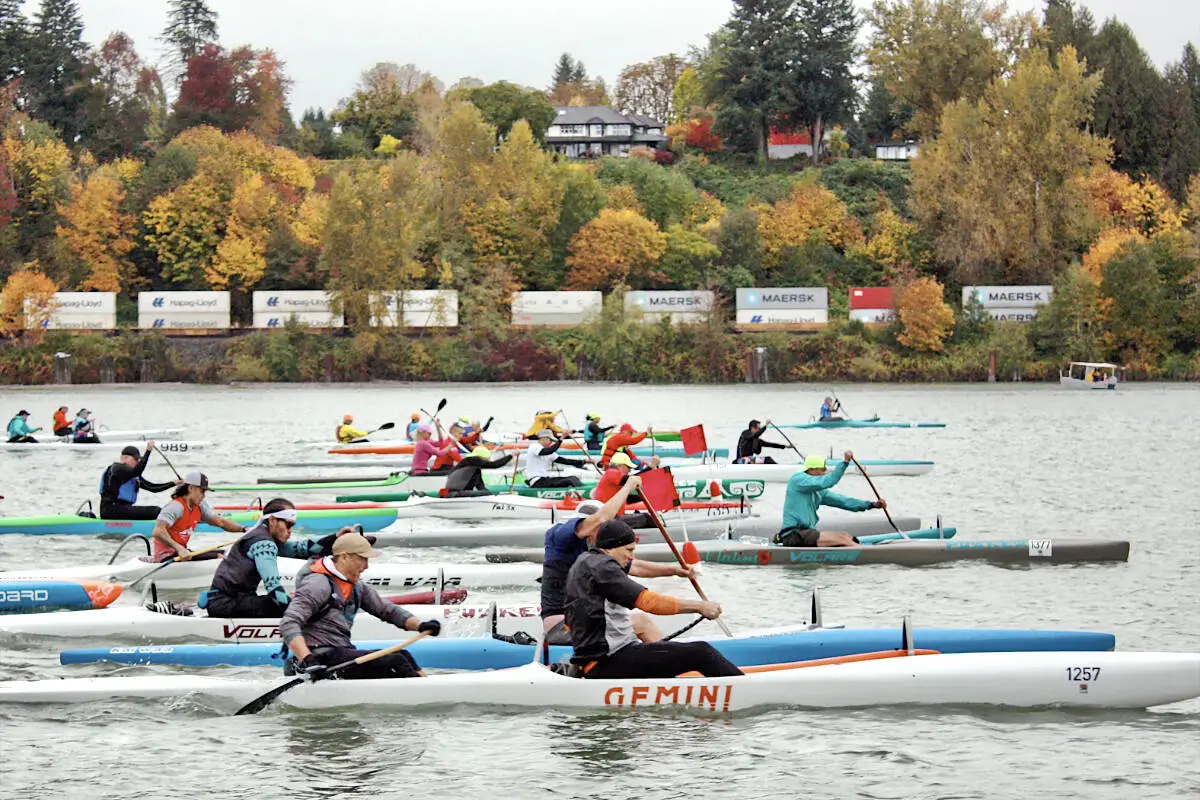 Nearly 50 paddlers gathered at Derby Reach Regional Park on October 25 for the Fort Langley Canoe Club's final competition of the season, with racers competing in surfskis, outrigger canoes, and stand-up paddleboards over 8 km and 12 km courses on the Fraser River.
