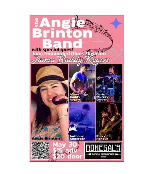 - Description: Angie Brinton Band and James 'Buddy' Rogers will be hitting the stage at Donegal's Irish House in Surrey on May 30th.