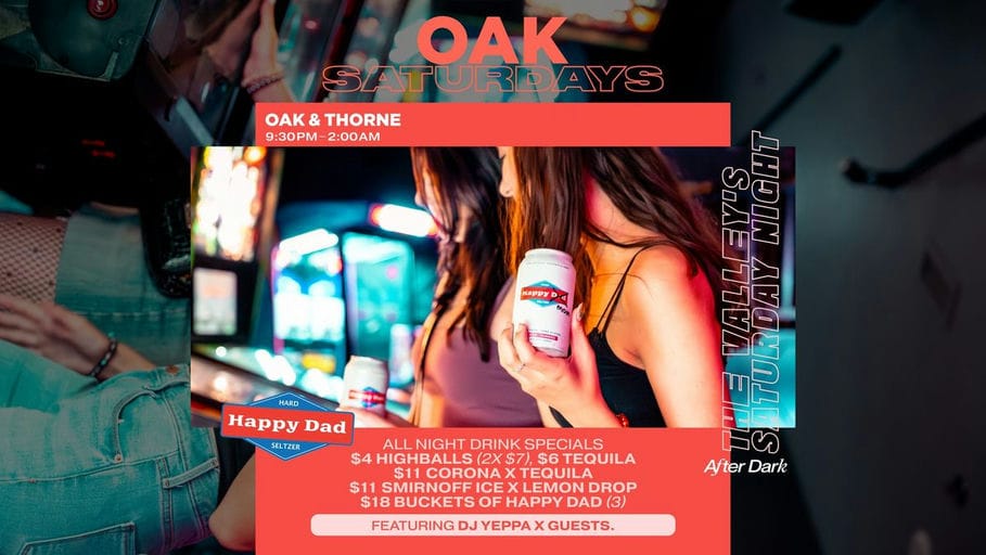 - Description: Join us for Oak Saturdays at Oak & Thorne as we transform your Saturday night with the hottest beats and coolest vibes.
